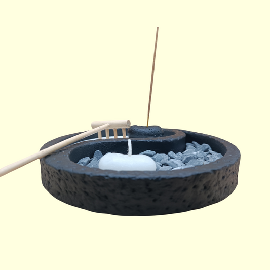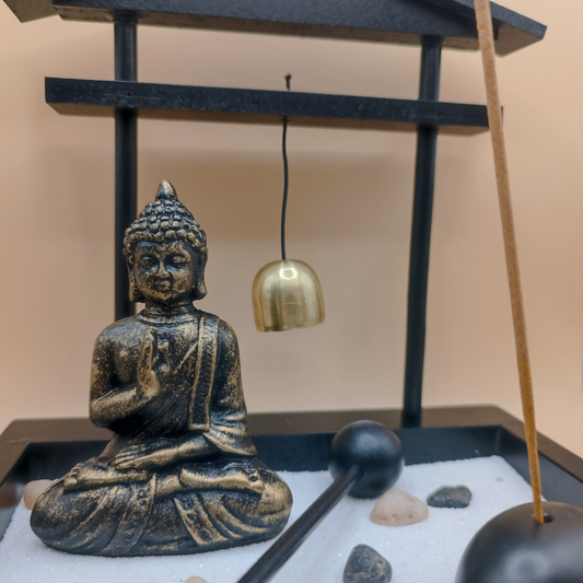Chaque composition, inspirée de la tradition japonaise, comprend une statue de Bouddha, du sable fin, des petites pierres naturelles ainsi que de l'encens et leur support.