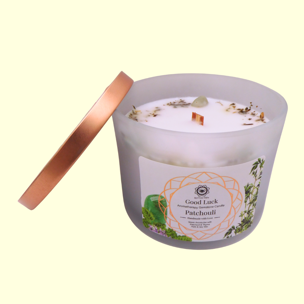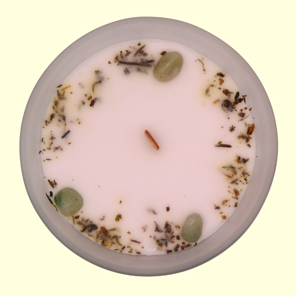 Bougie artisanale à base de cire de soja, d'huiles essentielles et de fleurs séchées de 256gr.