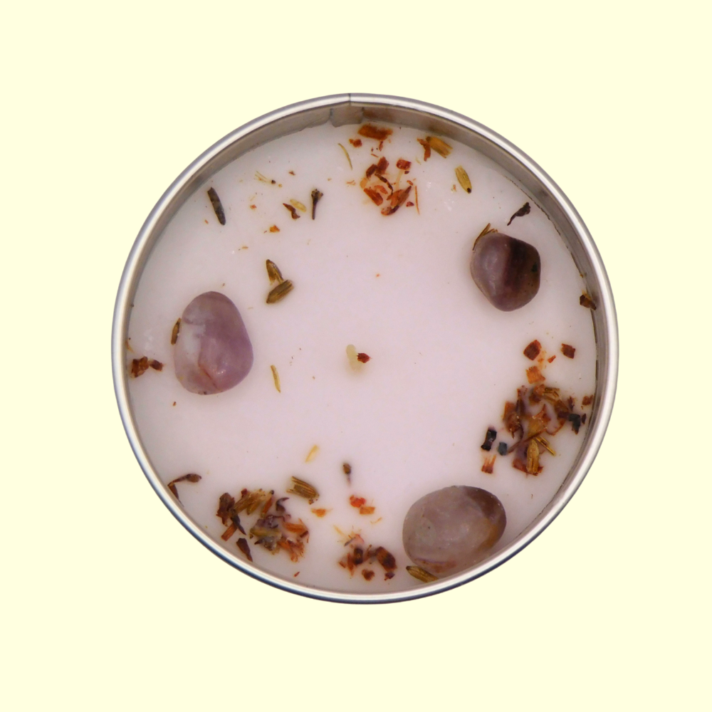 Bougie artisanale à base de cire de soja, d'huiles essentielles et de fleurs séchées de 70gr.