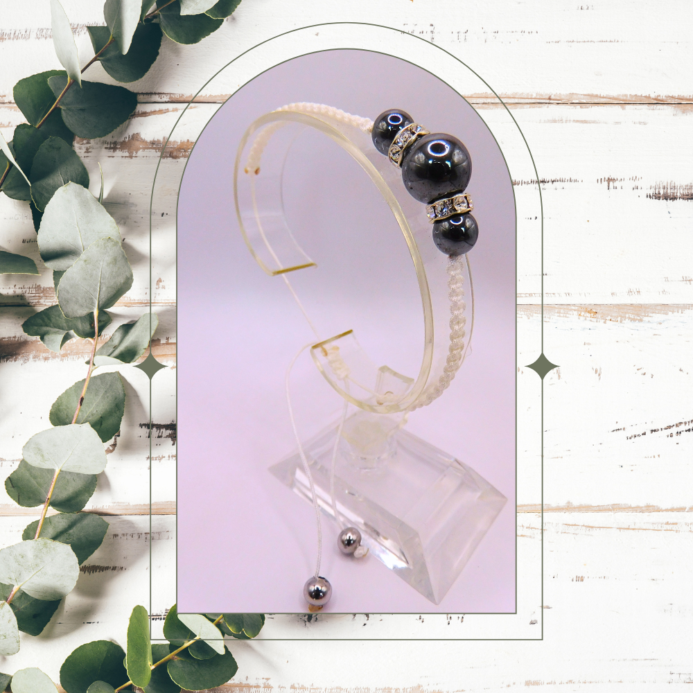 Bracelet artisanal réglable tissé avec des perles d'hématite, des intercalaires strass argenté et un fil blanc.