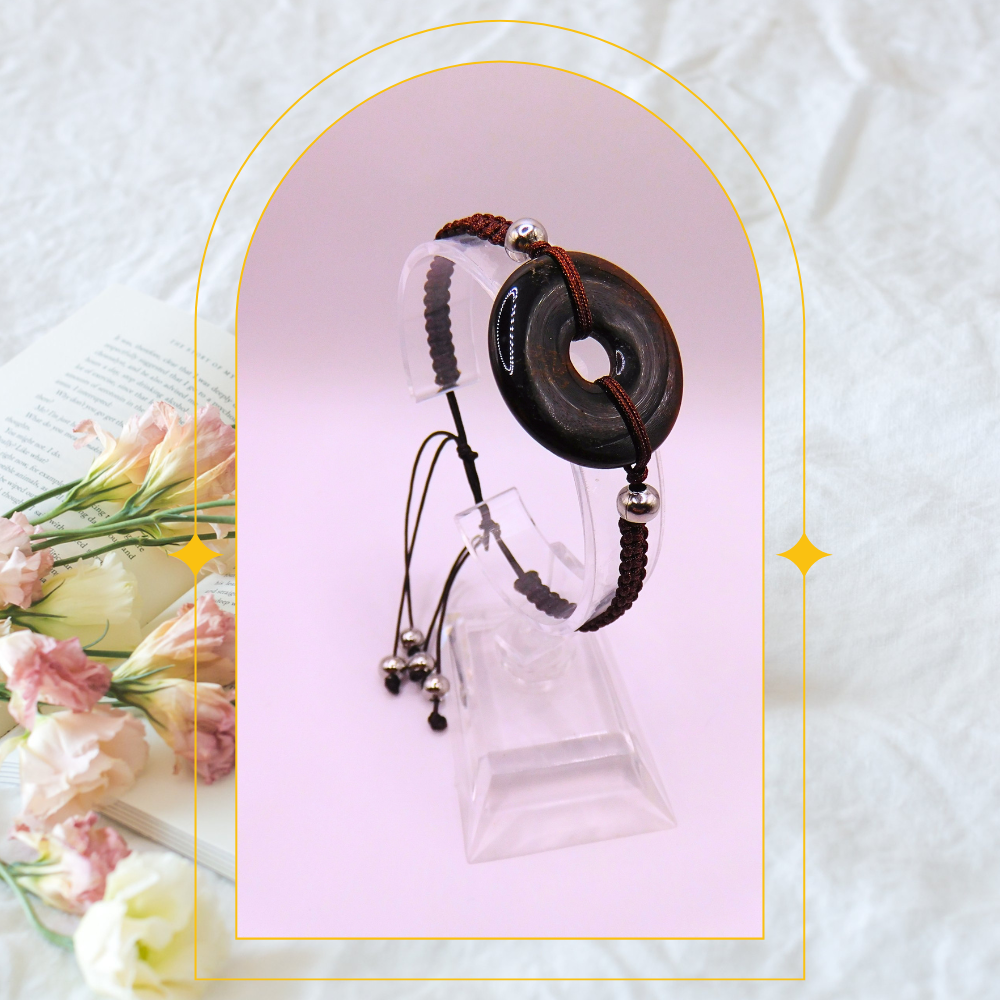 Bracelet réglable avec donut en Oeil de Tigre de 30 mm, avec des intercalaires en acier inoxydable argenté.