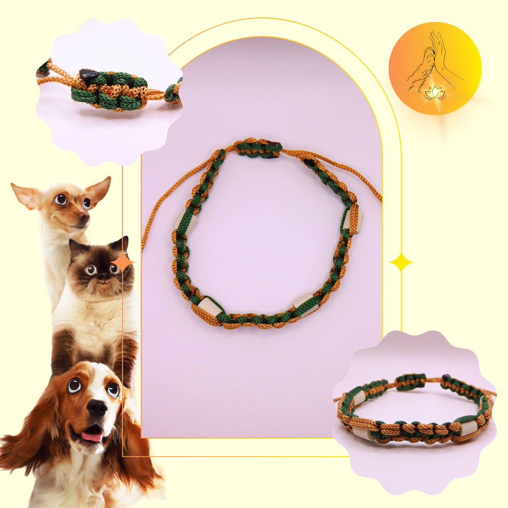 Colliers anti-puces et anti-tiques fabriqués de manière artisanale en paracorde avec des fils de couleurs vert sapin et caramel et composé de perles en céramique.