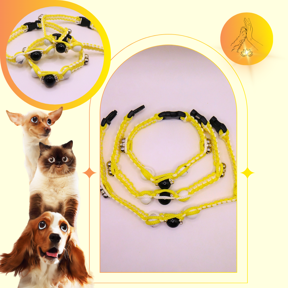 Colliers thérapeutiques en paracorde de couleurs jaune et blanc et composés de perles d'howlite blanche et d'obsidienne oeil céleste. Contient également des perles intercalaires en acier inoxydable argenté. Colliers non réglables avec un fermoir en plastique.