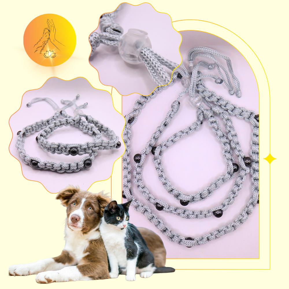 Colliers thérapeutiques en paracorde de couleur gris clair et composés de perles d'hématite de 10mm. Colliers réglables avec un fermoir en plastique.