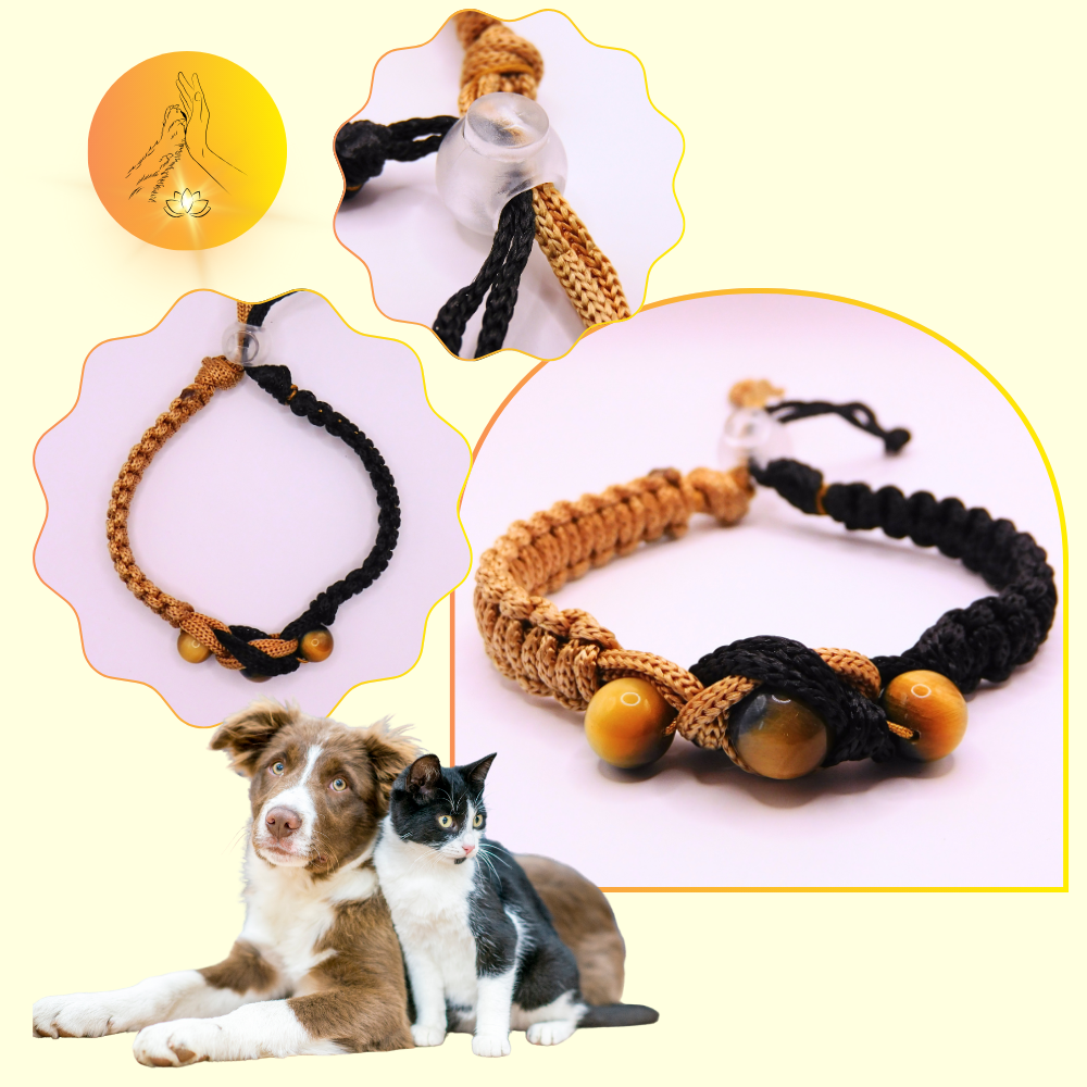 Colliers thérapeutiques en paracorde de couleurs caramel et noir et composés de perles d'oeil de tigre blanc. Colliers réglables avec un fermoir en plastique.