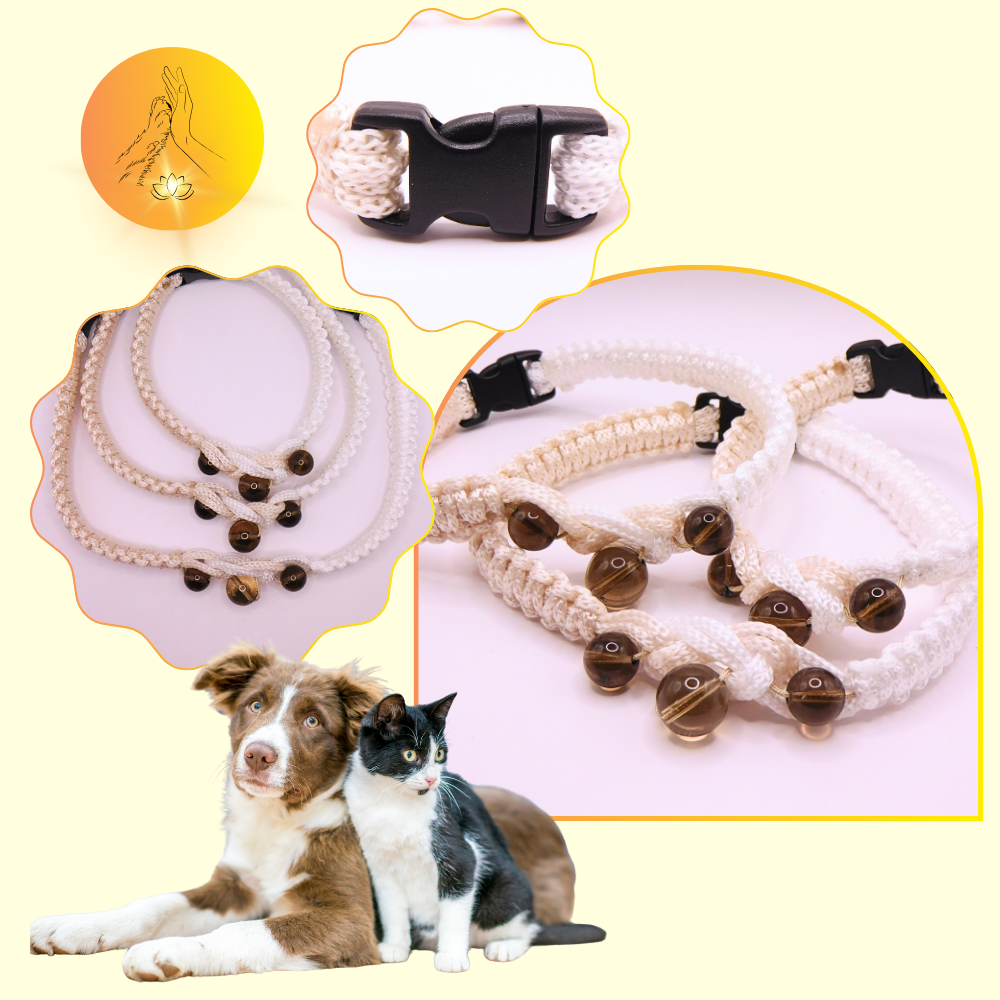 Colliers thérapeutiques en paracorde de couleurs champagne et blanc et composés de perles de quartz fumé. Colliers non réglables avec un fermoir en plastique.
