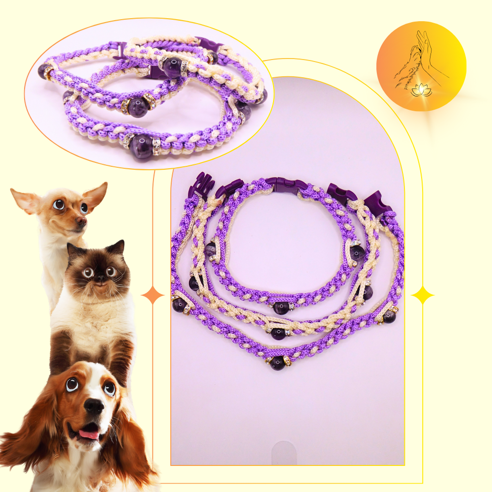 Colliers thérapeutiques en paracorde de couleurs violet et blanc et composés de perles d'améthyste rubanée. Contient également des perles intercalaires en acier inoxydable doré ou argenté. Colliers non réglables avec un fermoir en plastique.