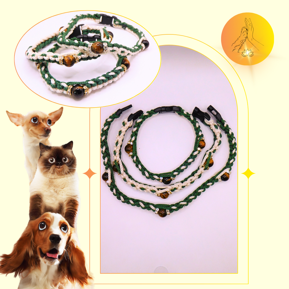 Colliers thérapeutiques en paracorde de couleurs vert sapin et blanc et composés de perles d'oeil de tigre. Contient également des perles intercalaires en acier inoxydable doré ou argenté. Colliers non réglables avec un fermoir en plastique.