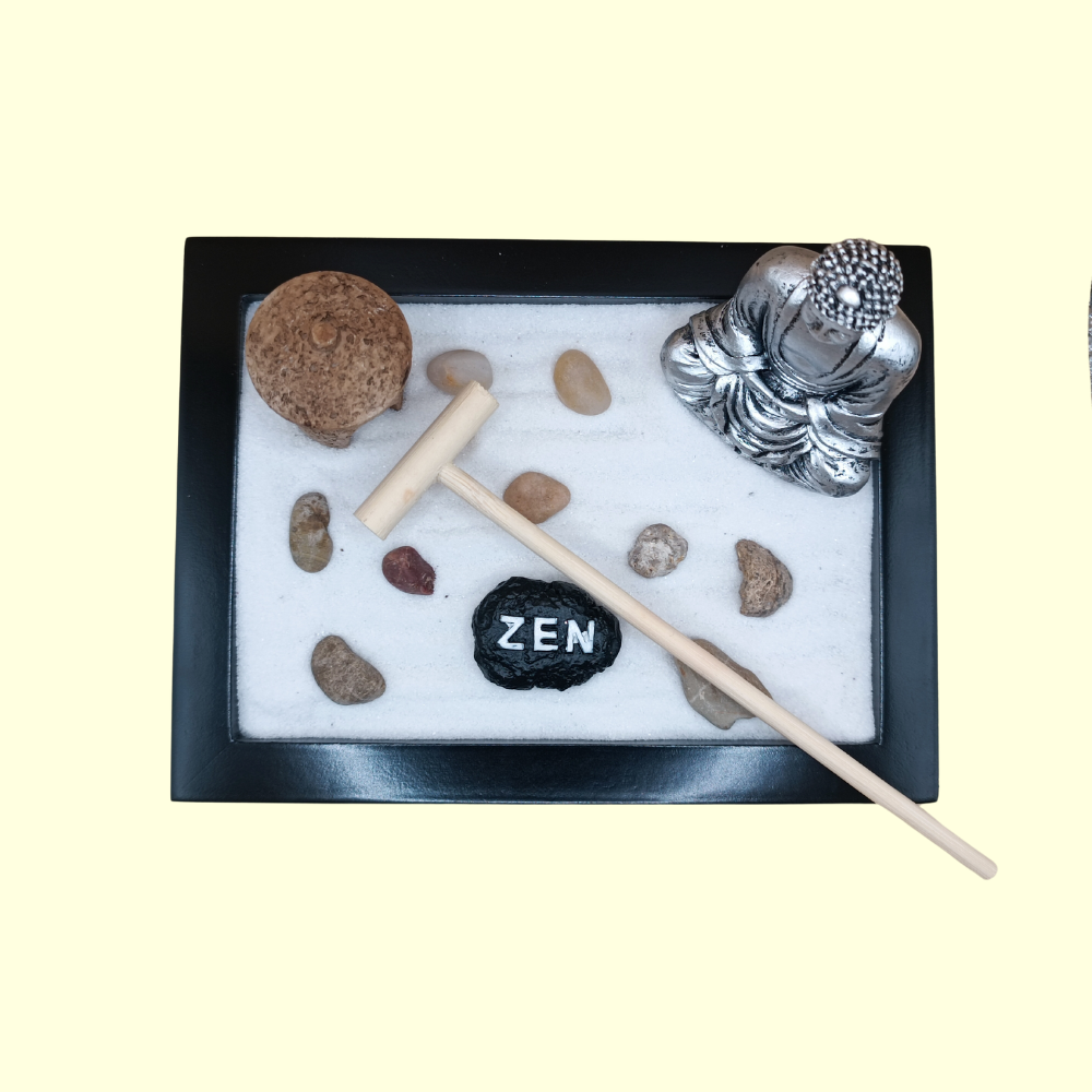 Jardin zen avec bouddha, sable, pierres, encens et bougie d'environ 16 cm.