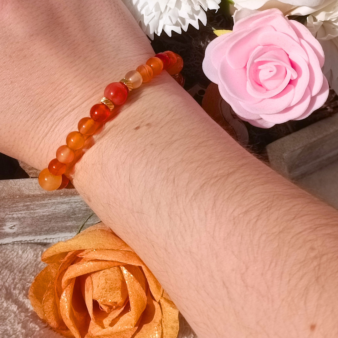 Bracelet en perles naturelles constitué de perles de Cornaline 6 mm et 8 mm, des intercalaires tubes travaillés en doré 24k et de séparateurs en acier inoxydable