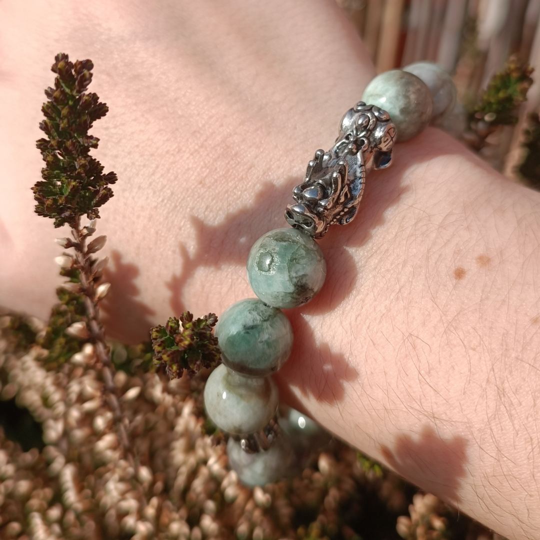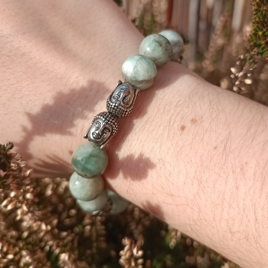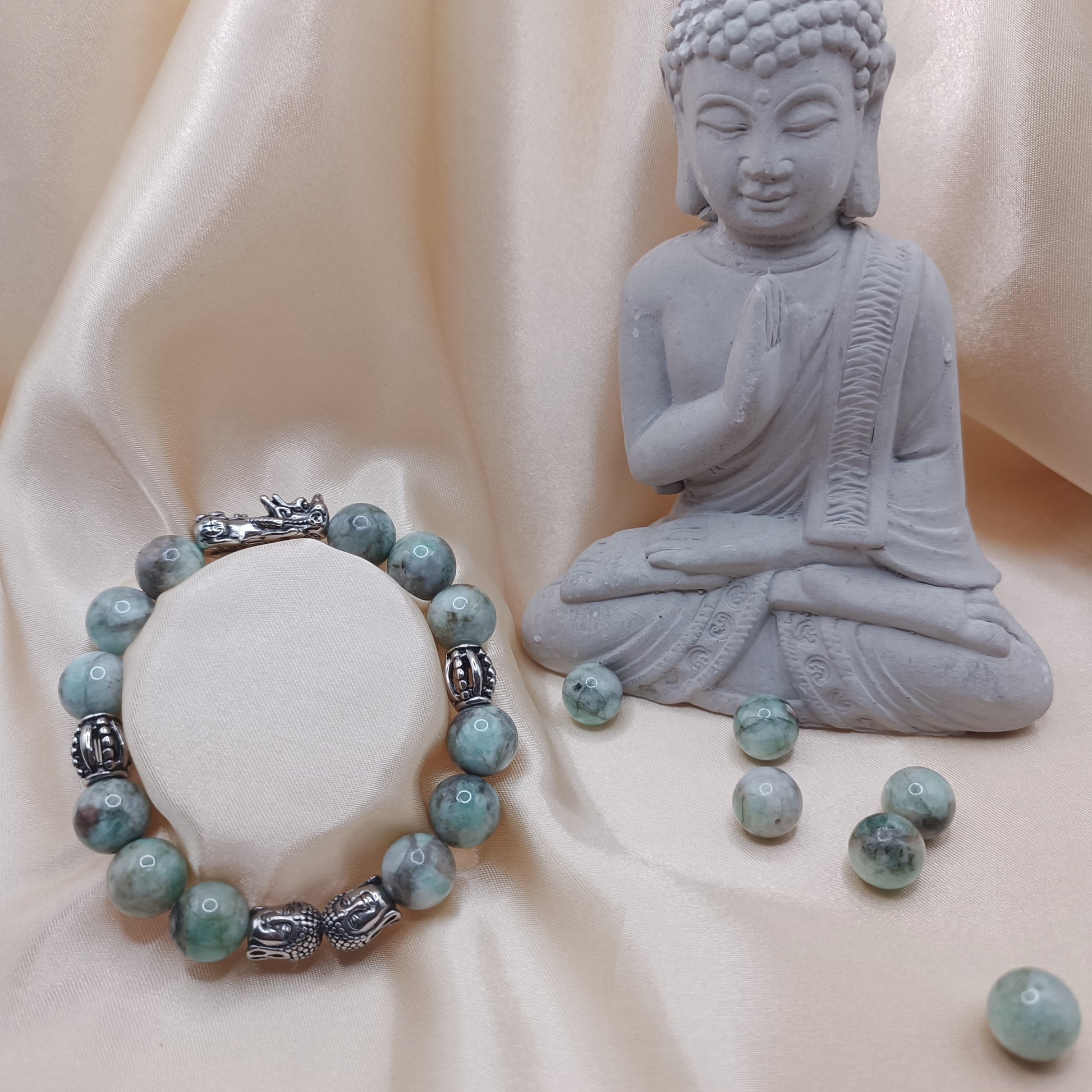 Bracelet en perles d'émeraude de 12 mm, avec des intercalaires en acier inoxydable.