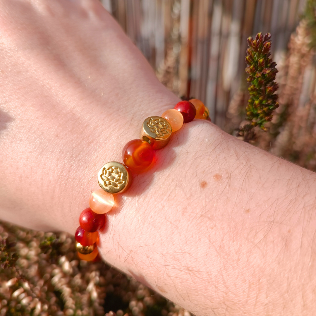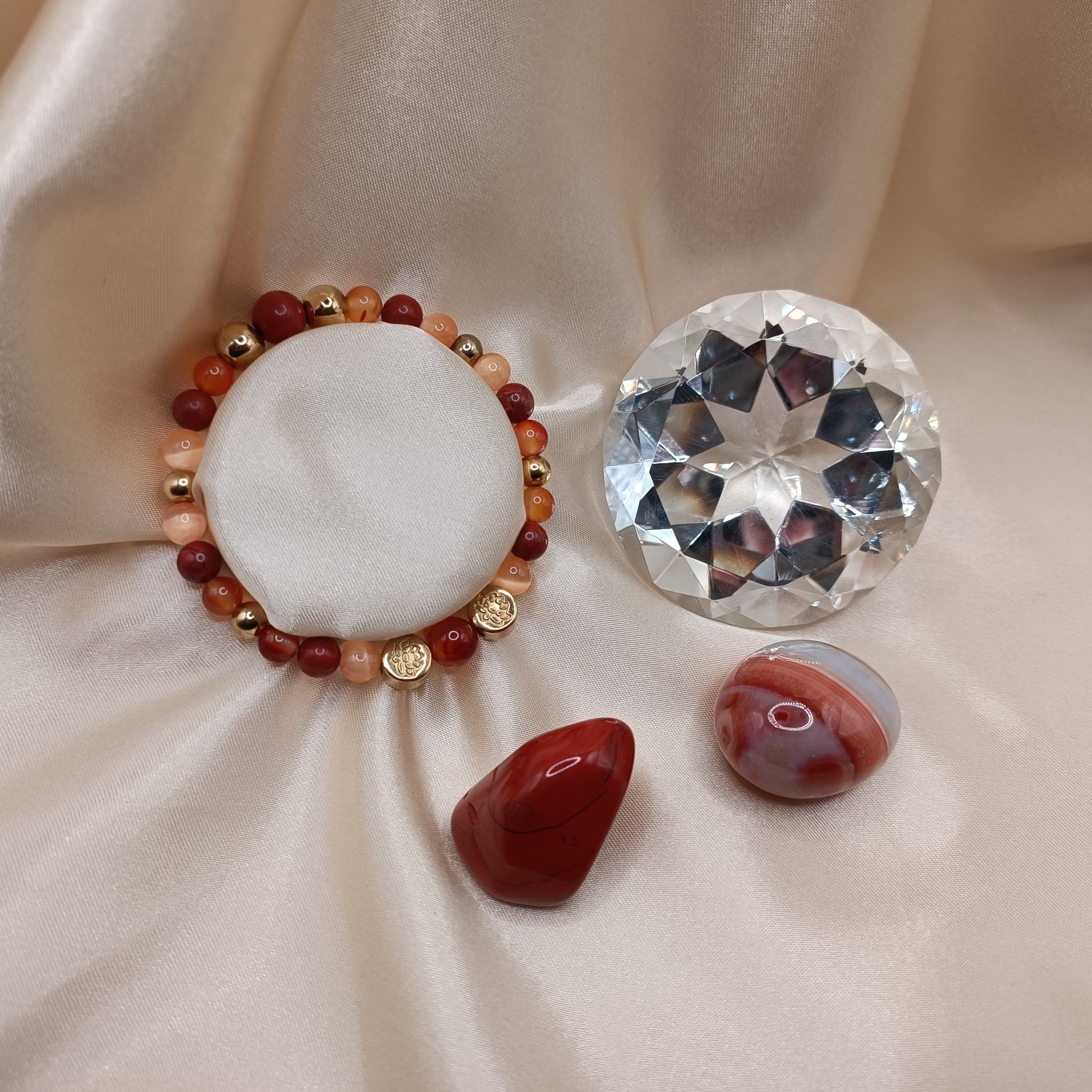 Bracelet en perles de cornaline, jaspe rouge et sélénite orange de 6 et de 8 mm.