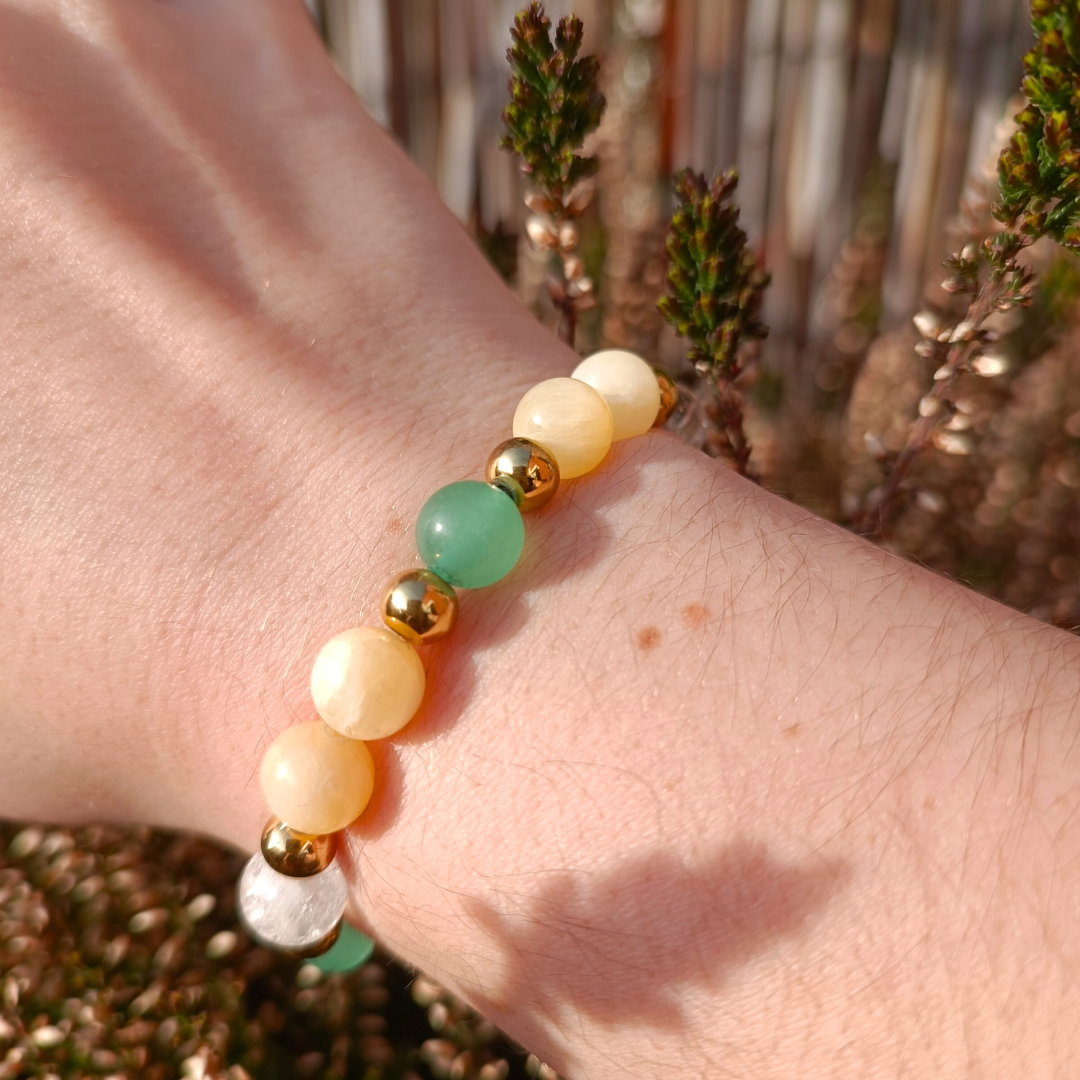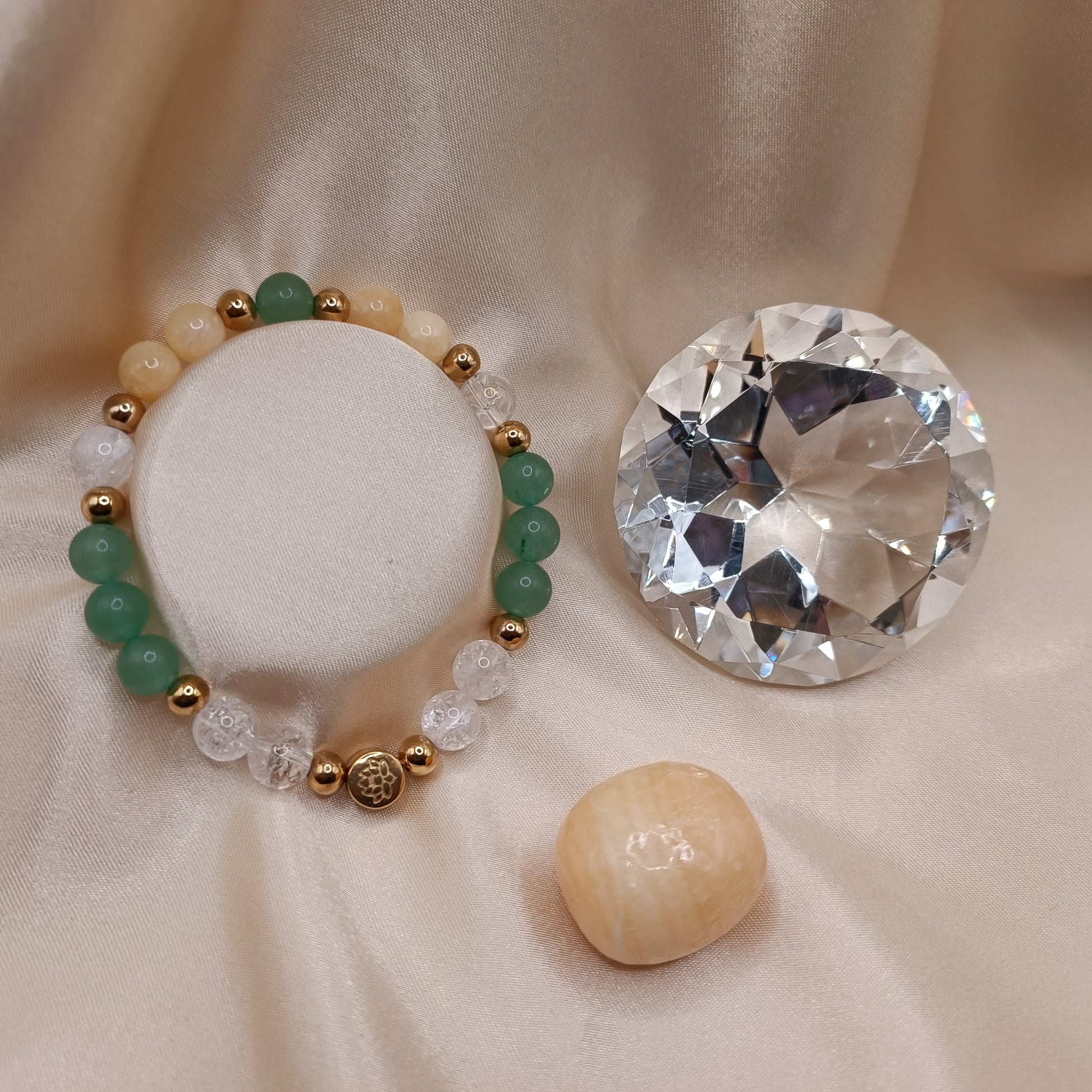 Bracelet en perles de calcite orange, aventurine verte et cristal de roche craquelé de 8 mm.