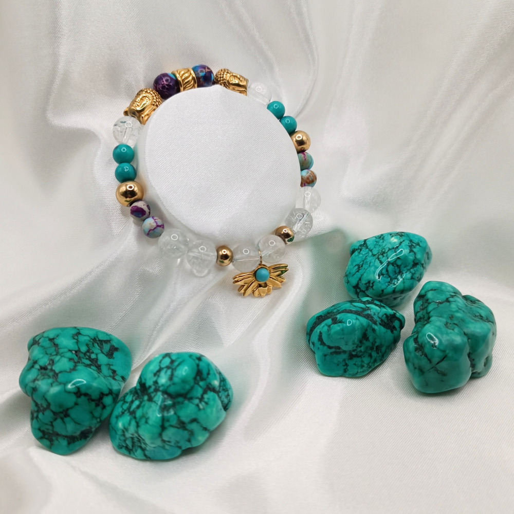 Ce bracelet est composé de perles de Jaspe impérial 8 mm et 6 mm, Turquoise de 6 mm, Cristal crack de 8 mm.