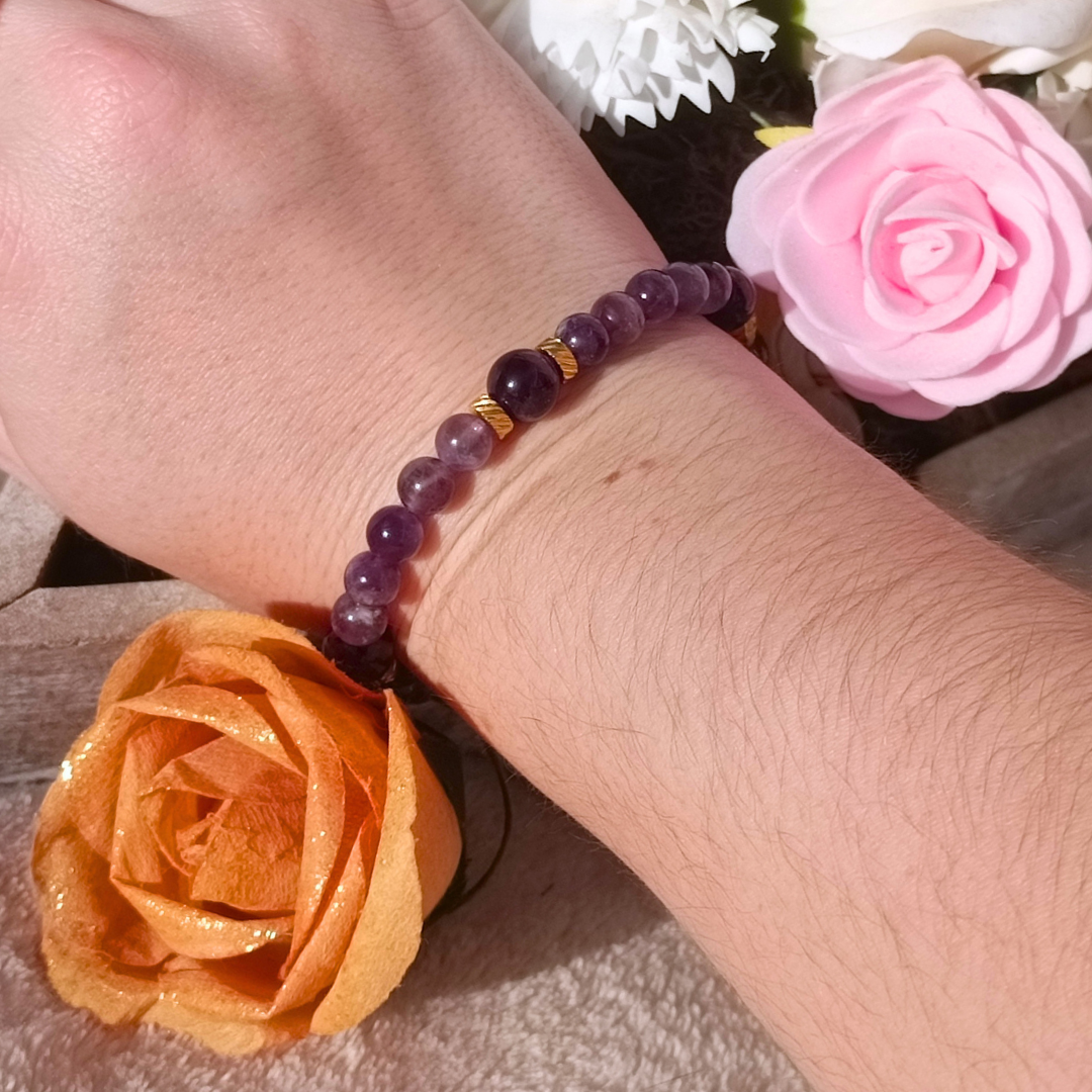 Bracelet en perles naturelles constituées de perles d'Améthyste A 6 mm, de perles de Dark Améthyste 8 mm, des tubes intercalaires travaillés en doré 24K et des séparateurs en acier