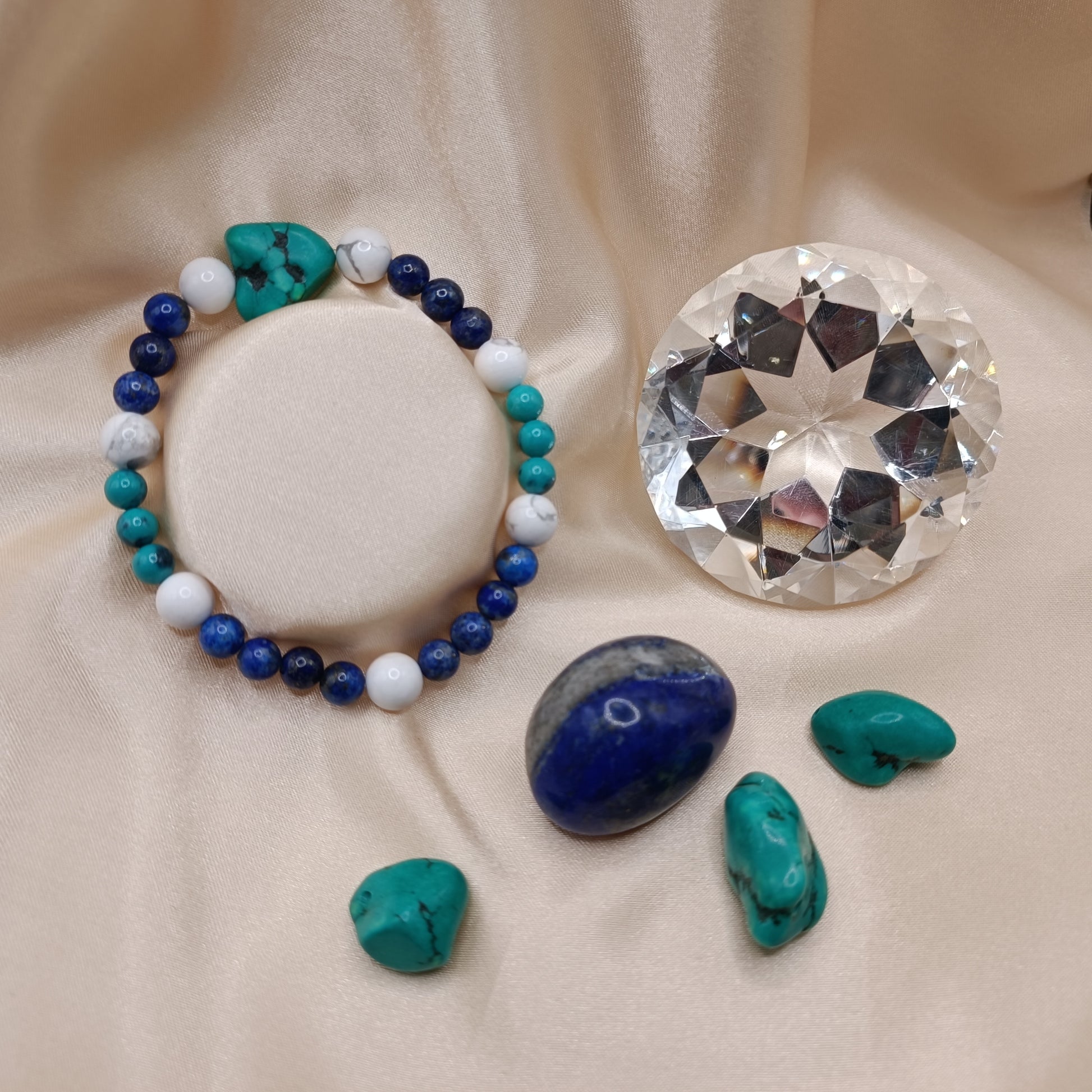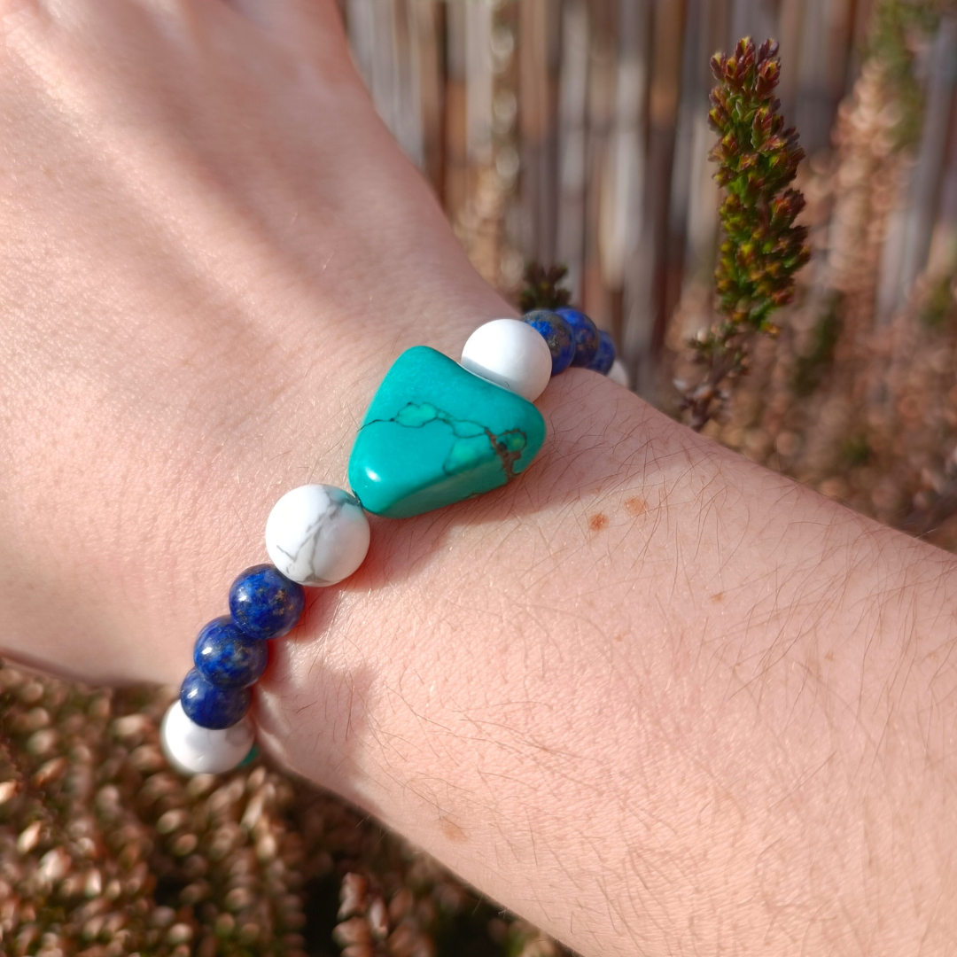Bracelet en perles de turquoise, de lapis lazuli et d'howlite blanche de 6 et 8 mm.
