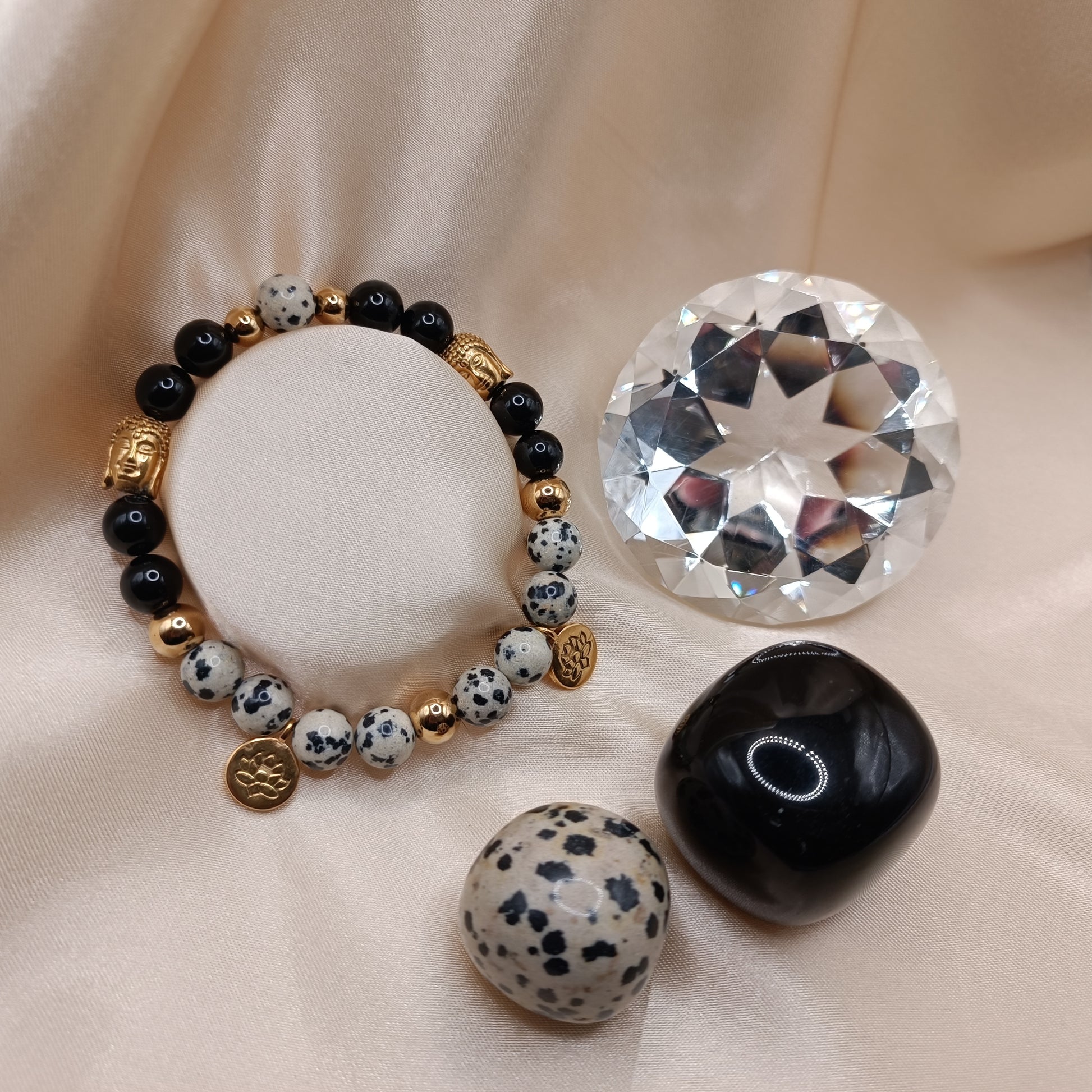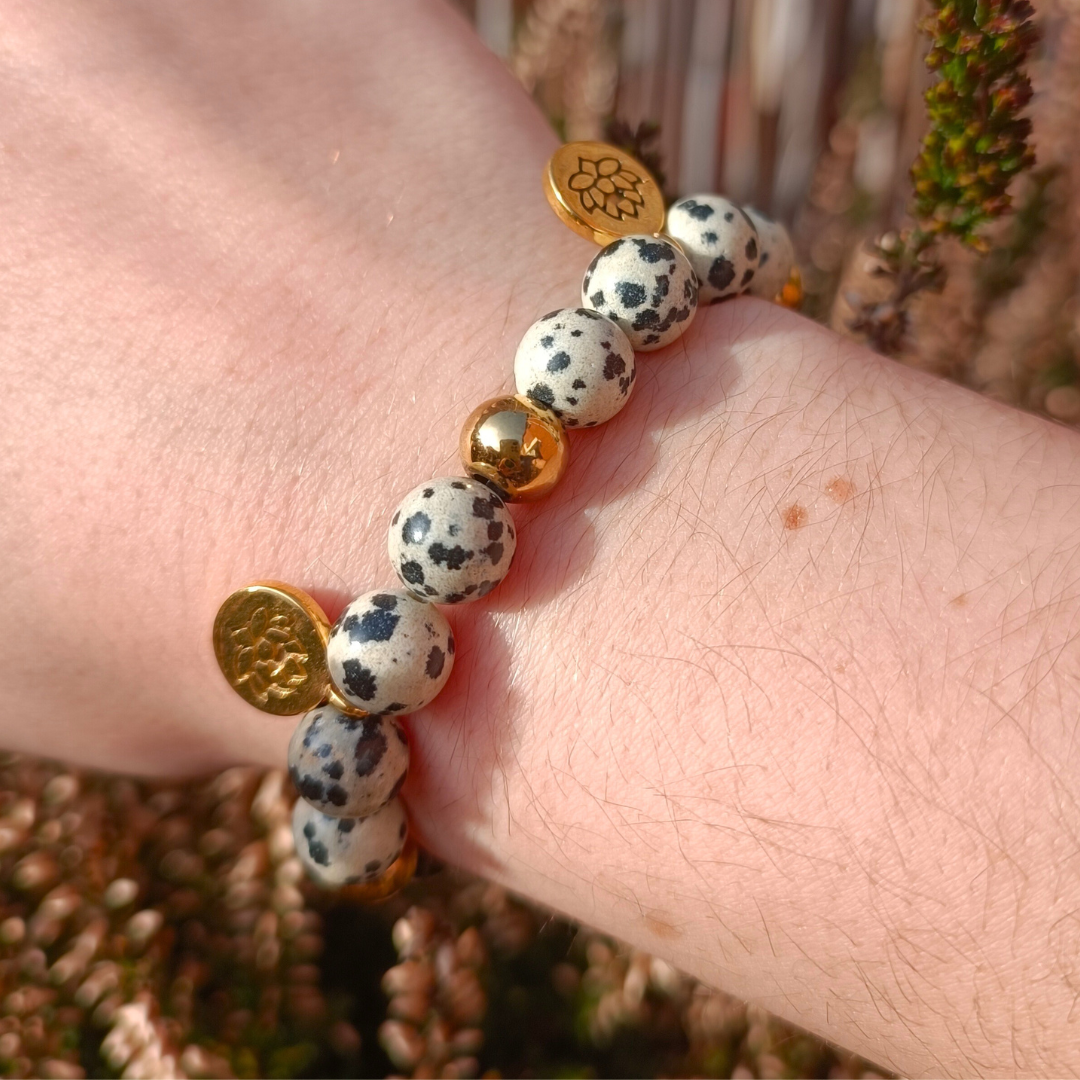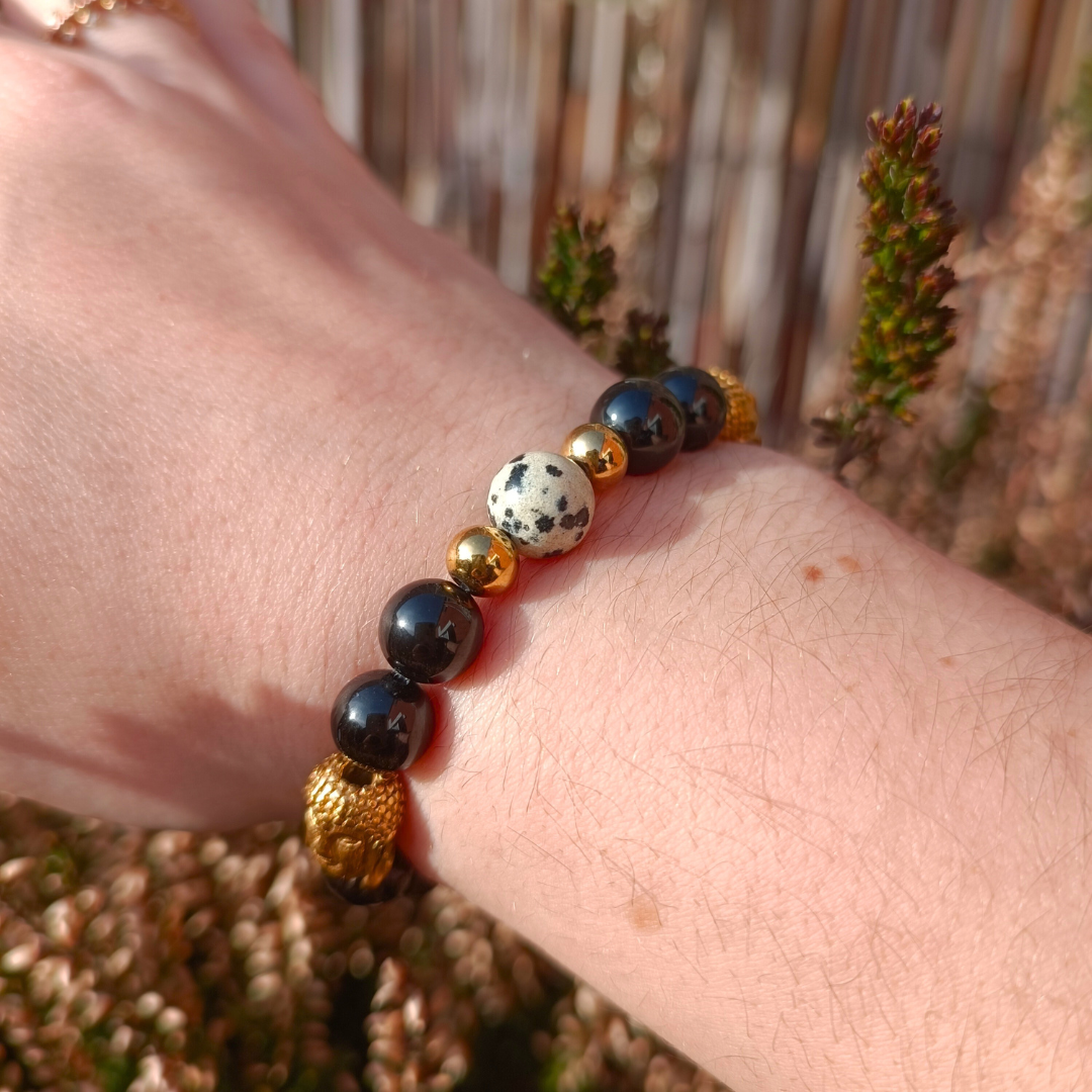Bracelet en perles de tourmaline noire et jaspe dalmatien de 8 mm. Pendentif motif fleur de lotus.