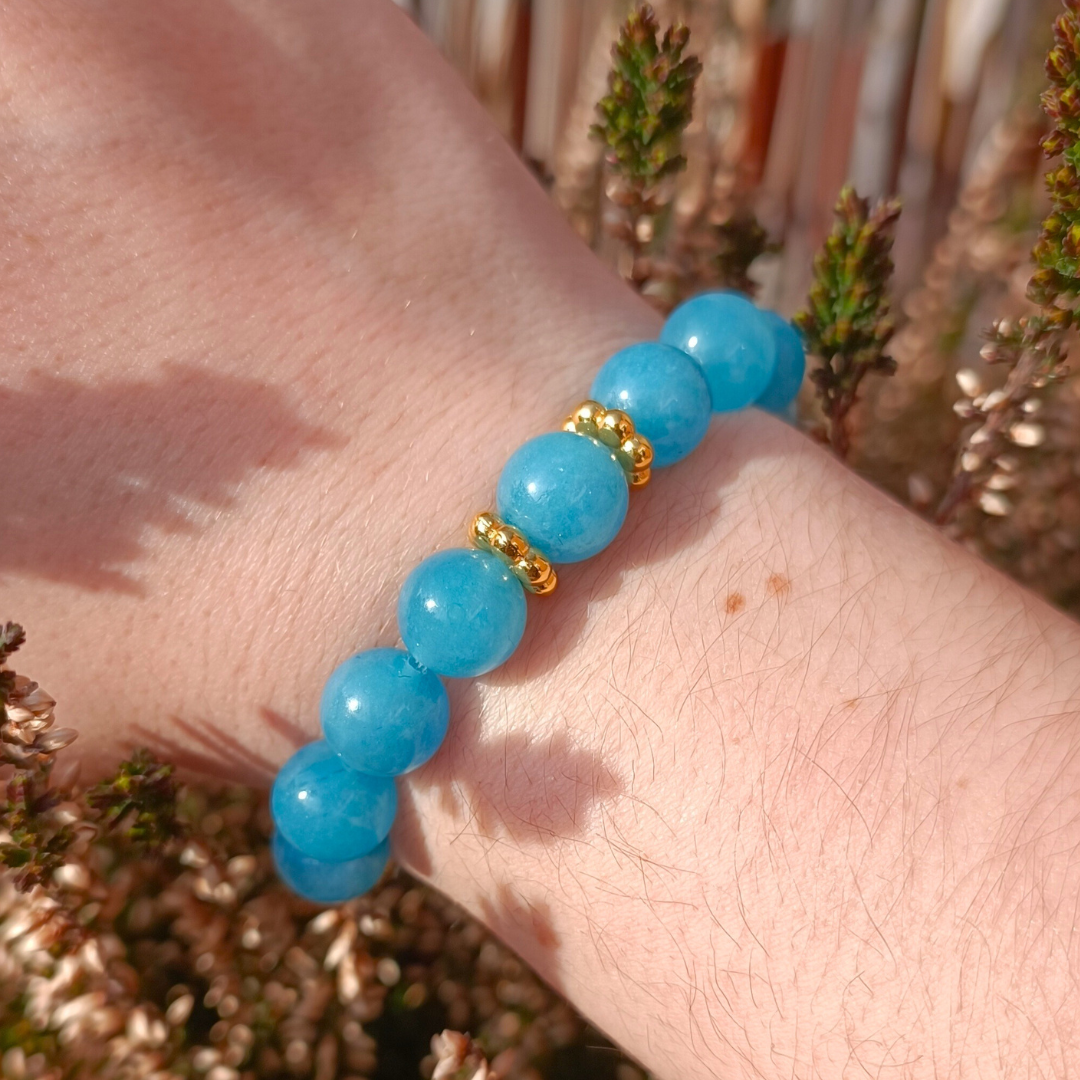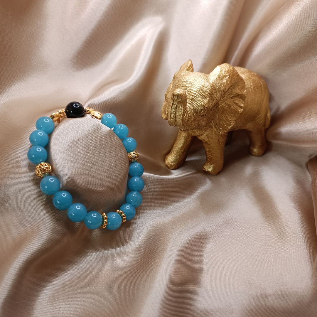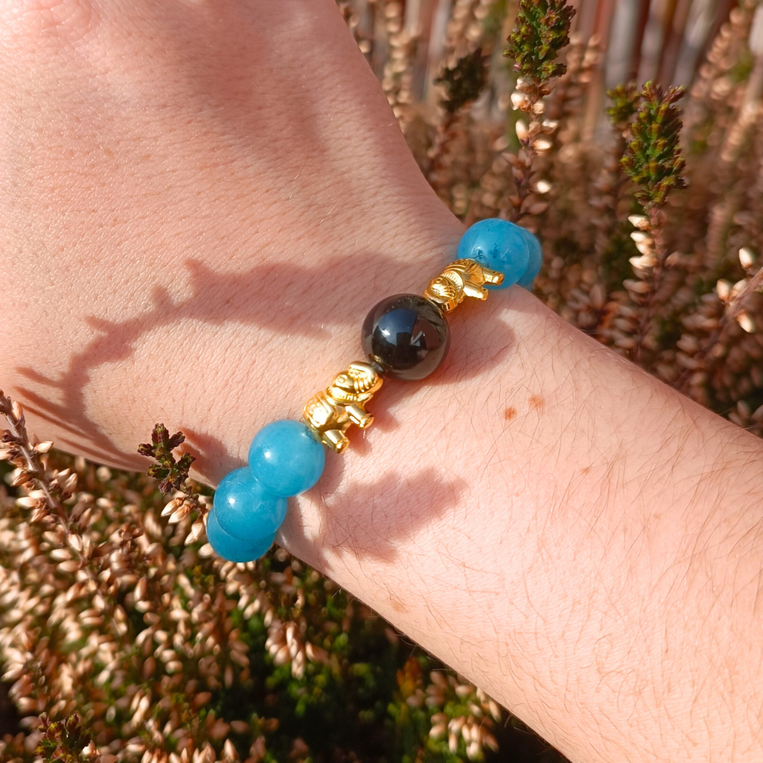 Bracelet en perles d'Obsidienne Oeil Céleste 12 mm AAA, de perles Quartz Bleu 10 mm A, des boules "charms" 8 mm, des intercalaires éléphants doré 24 k, des rondelles Fleurs 8,5 mm en doré 24 k.