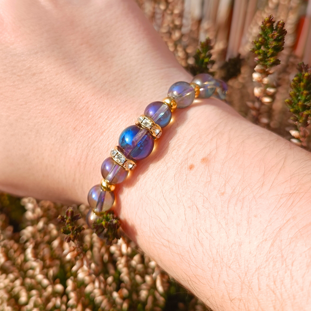 Bracelet en perles naturelles constitué de perles de Aqua Aura 8 mm et de 10 mm, de rondelles en strass doré 8 mm et de perles rondes dorées 5 mm