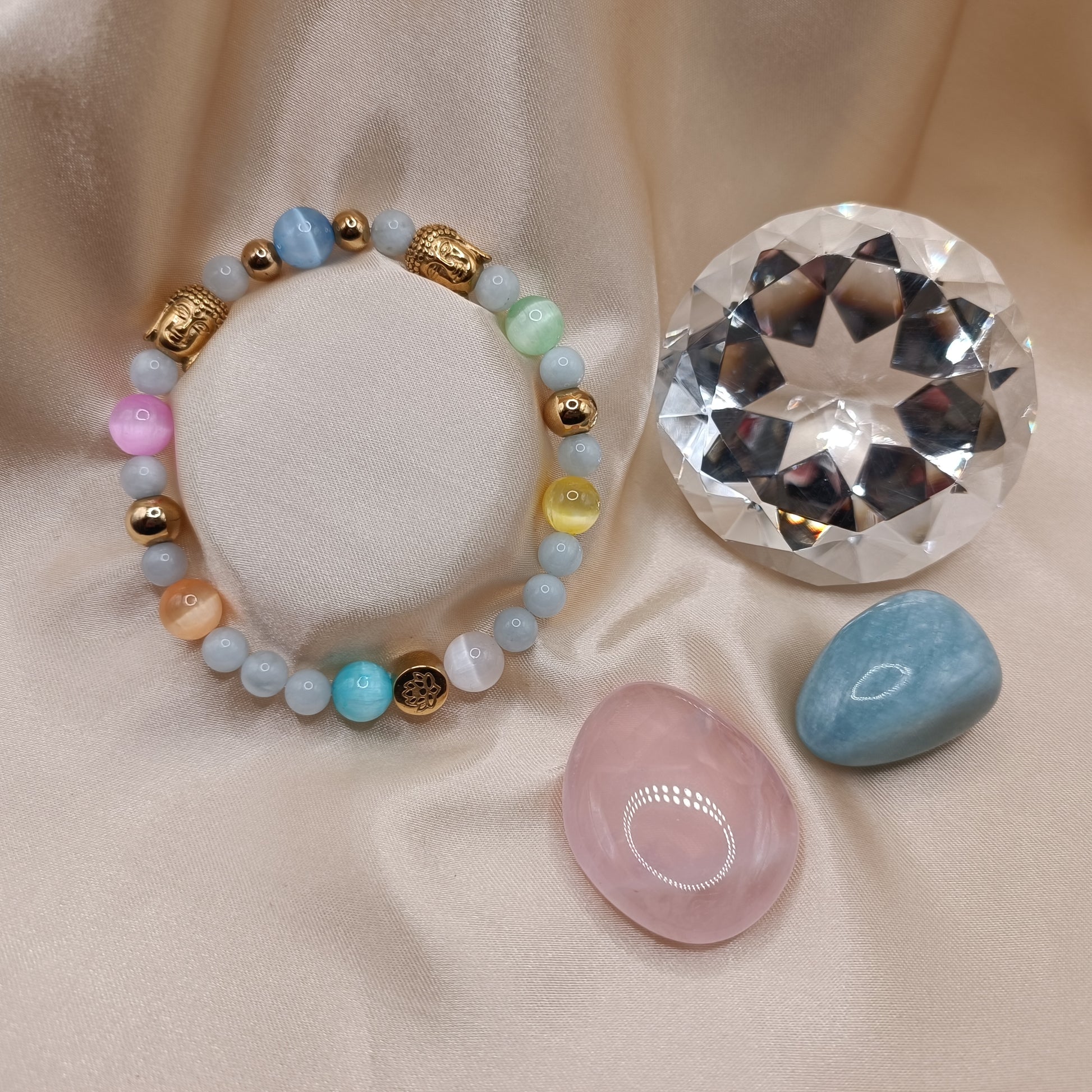 Bracelet en perles de sélénite arc-en-ciel et d'aigue marine de 6 et de 8 mm.