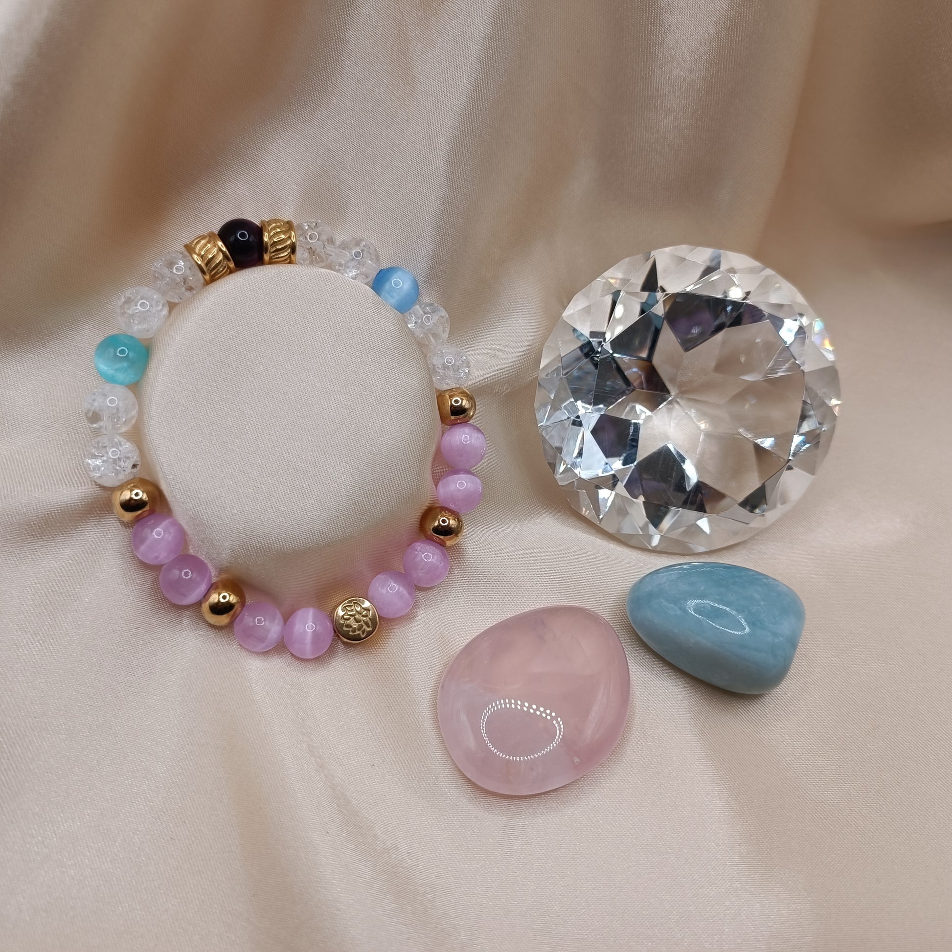 Bracelet en perles de sélénite, de cristal de roche craquelé et d'oeil de tigre teinté mauve de 8 mm.