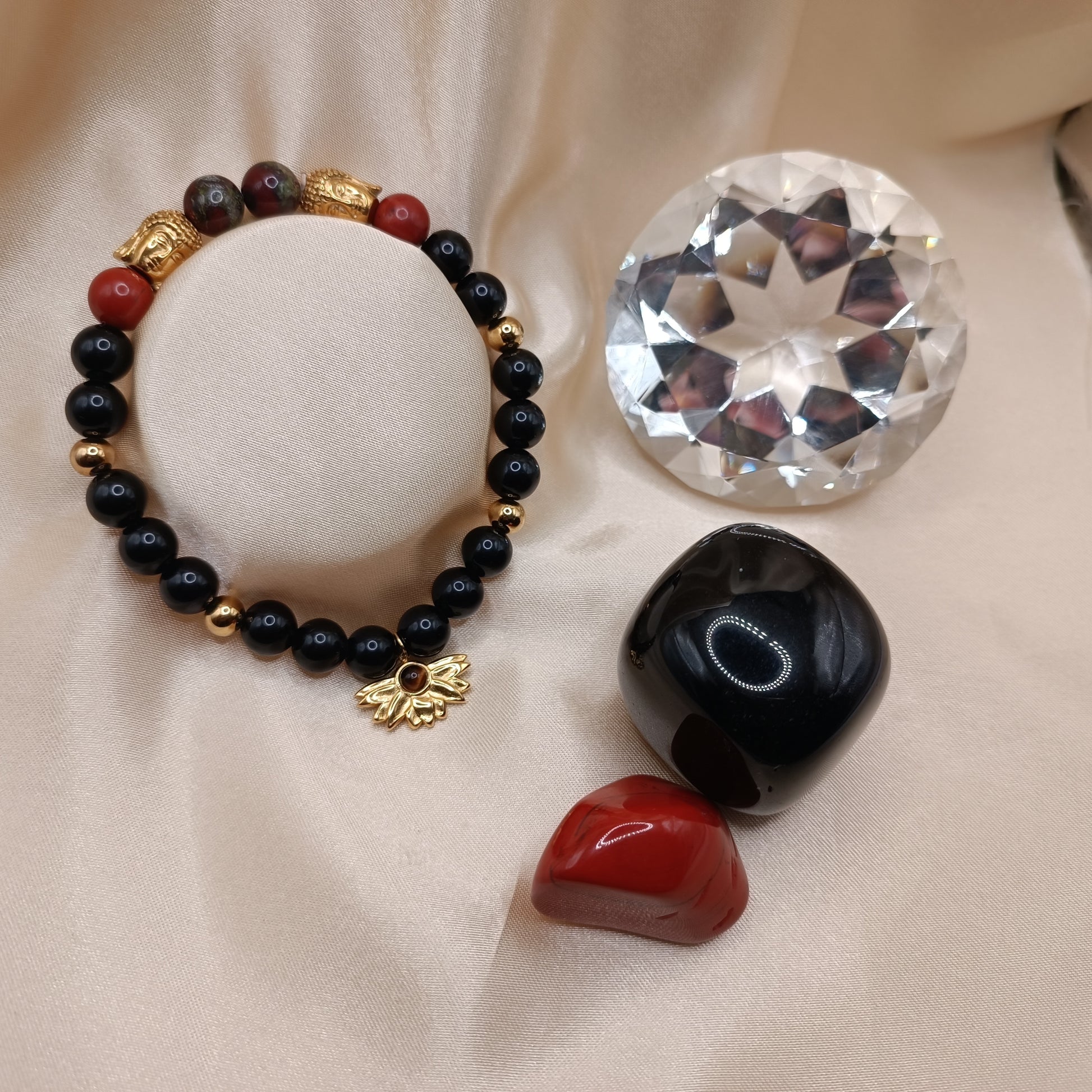 Bracelet en perles de jaspe rouge et sang de dragon, d'obsidienne noire de 8 mm. Pendentif doré avec perle d'oeil de tigre.