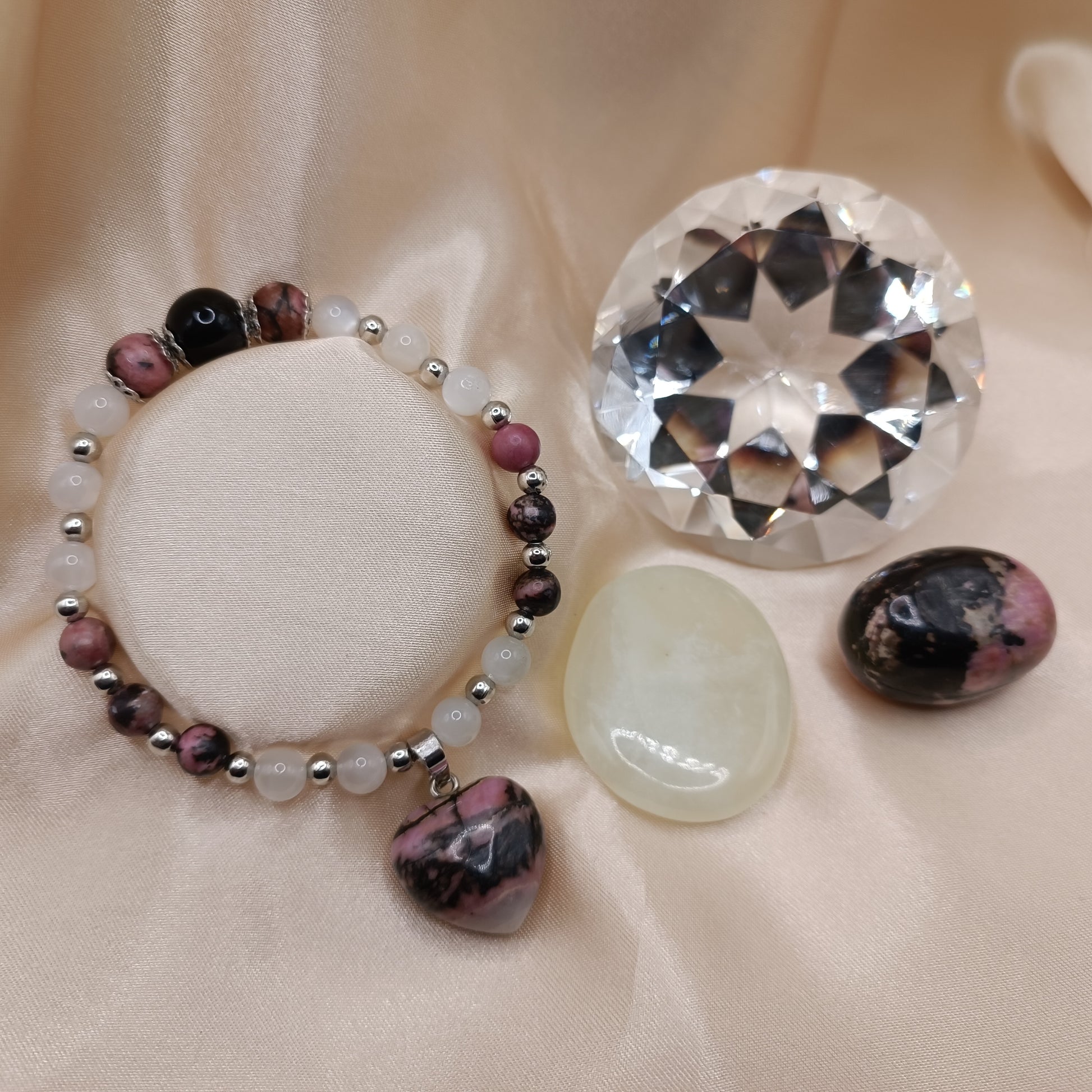 Bracelet en perles de rhodonite, tourmaline noire et pierre de lune de 6 et de 8 mm, pendentif en rhodonite et intercalaires en acier inoxydable.