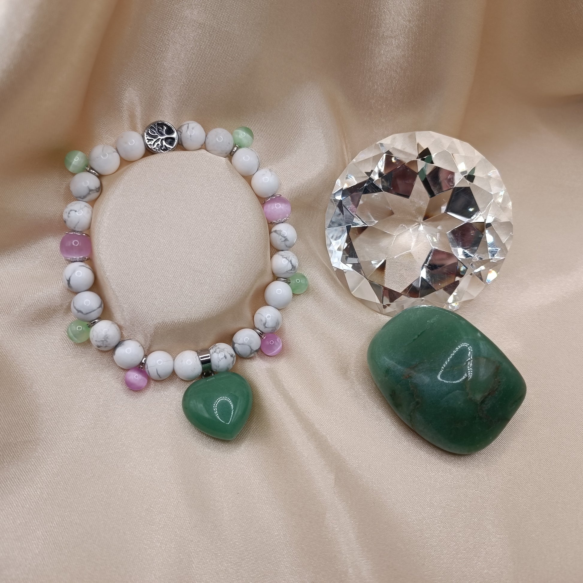 Bracelet en perles d'howlite blanche et de sélénite arc-en-ciel de 8 mm. Pendentif en aventurine verte.