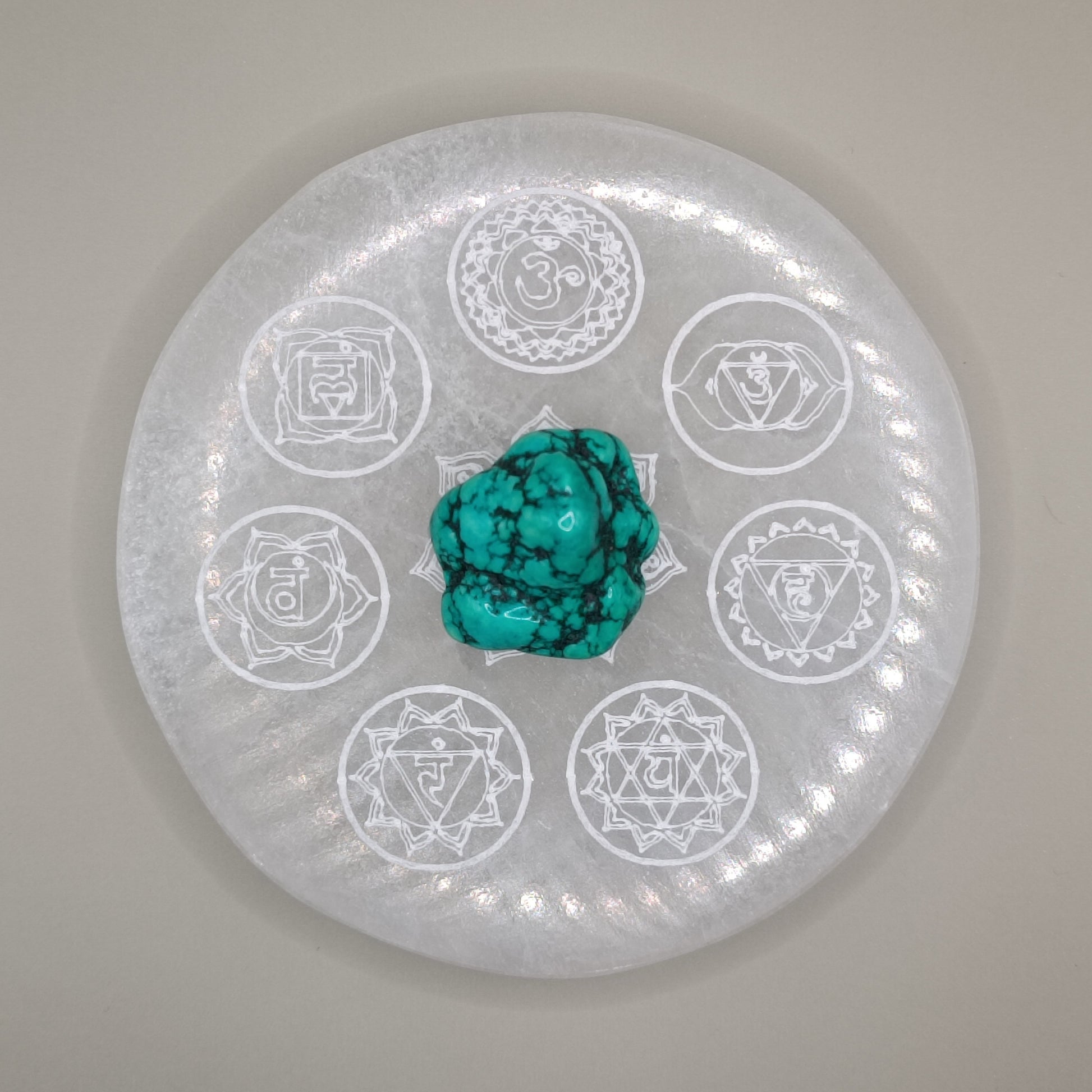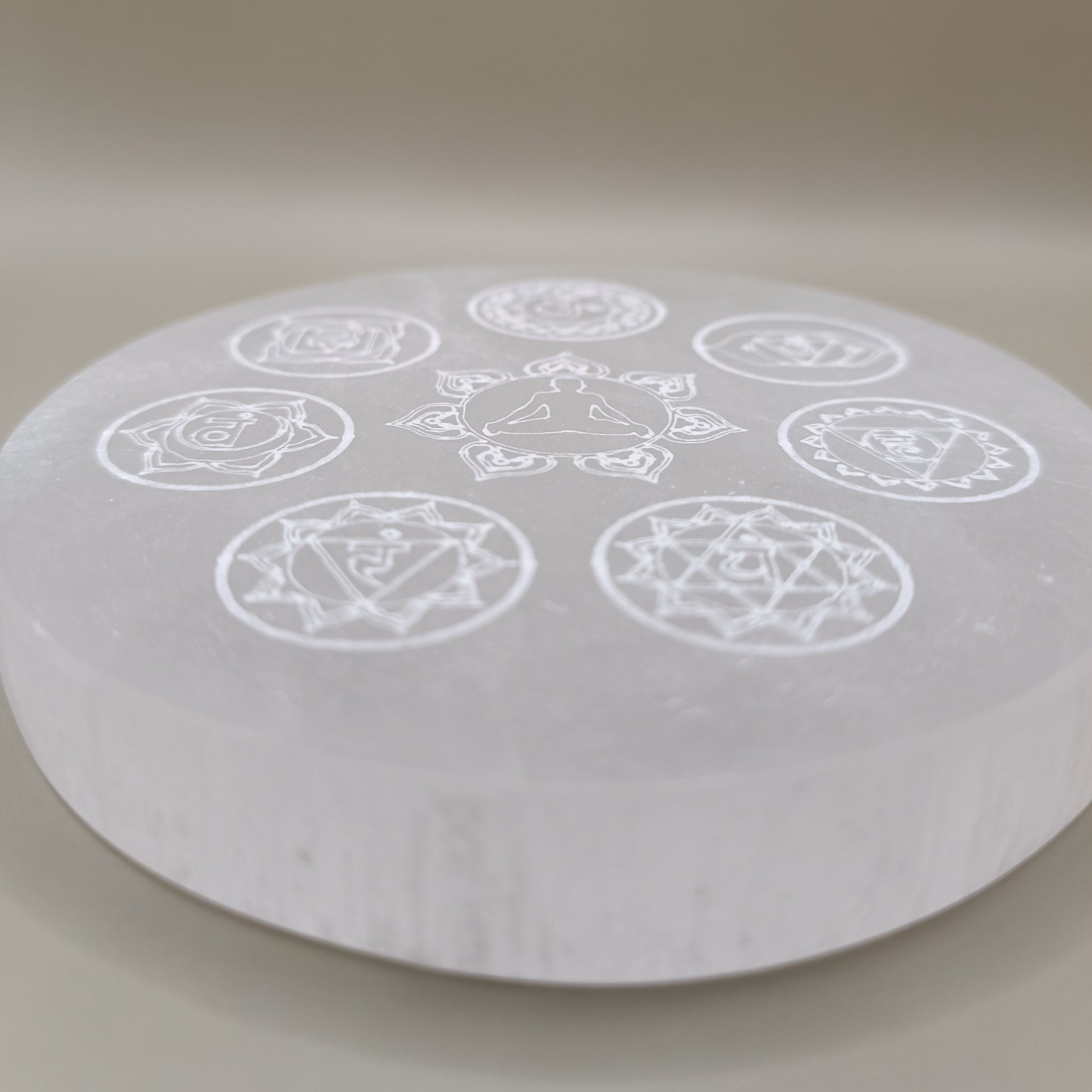 Plaque de rechargement en sélénite avec motif représentant les 7 chakras - environ 10 cm.