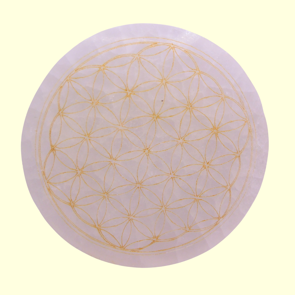 Plaque de rechargement en sélénite avec motif fleur de vie de couleur dorée - environ 10 cm.