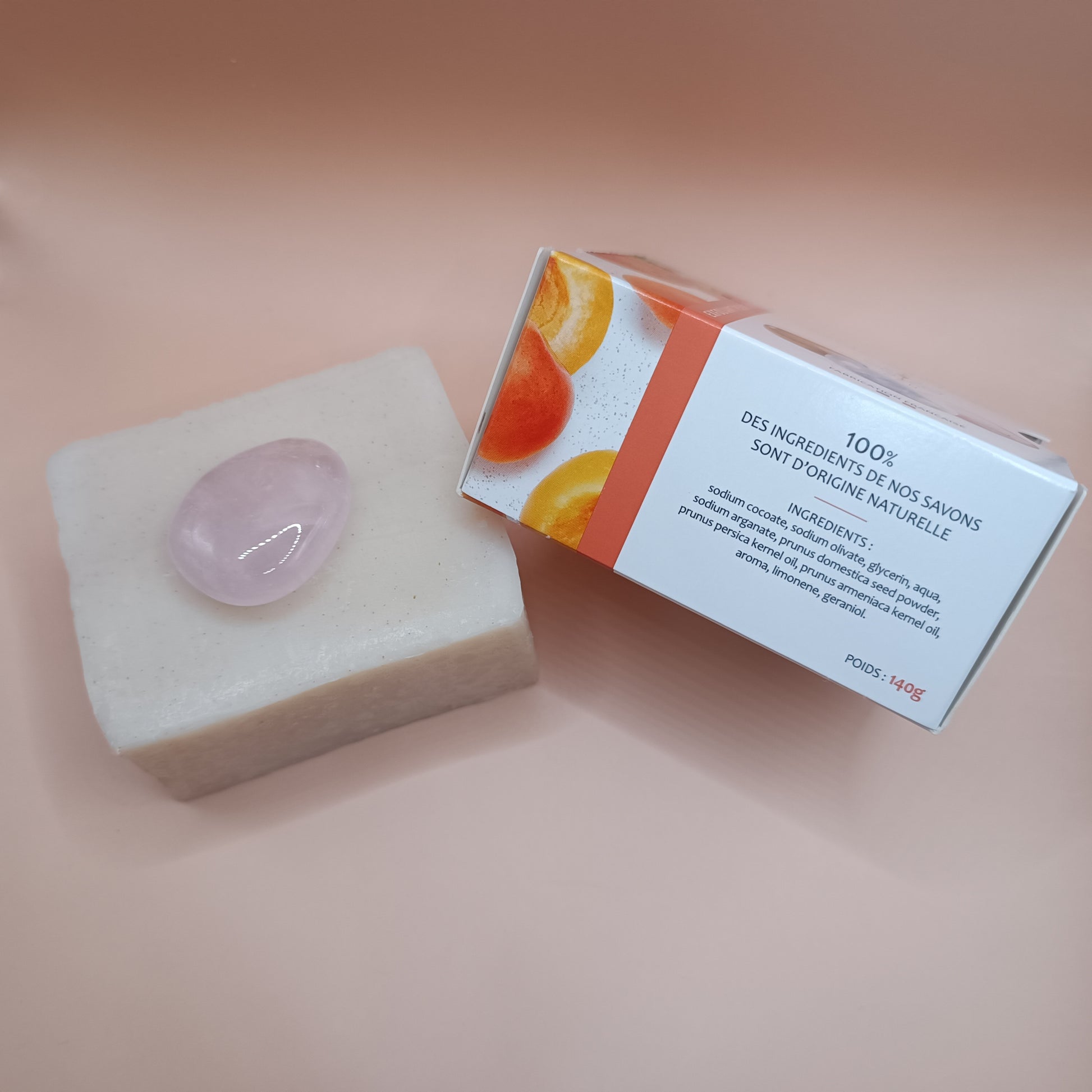 Savon exfoliant à la pêche et à l'abricot 100% naturel contenant une pierre minérale naturelle surprise.